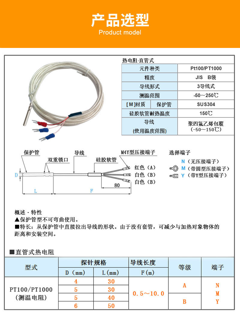 熱電阻外殼為不銹鋼304和316L,默認尺寸是直徑4mm*長度30mm(如要其他尺寸可咨詢客服),測溫范圍-50-200℃(另有特殊溫度范圍可選-200-200℃,或者是-50-500℃)引線是三線制雙包鐵氟龍鍍銀屏蔽線(防腐蝕耐油)。