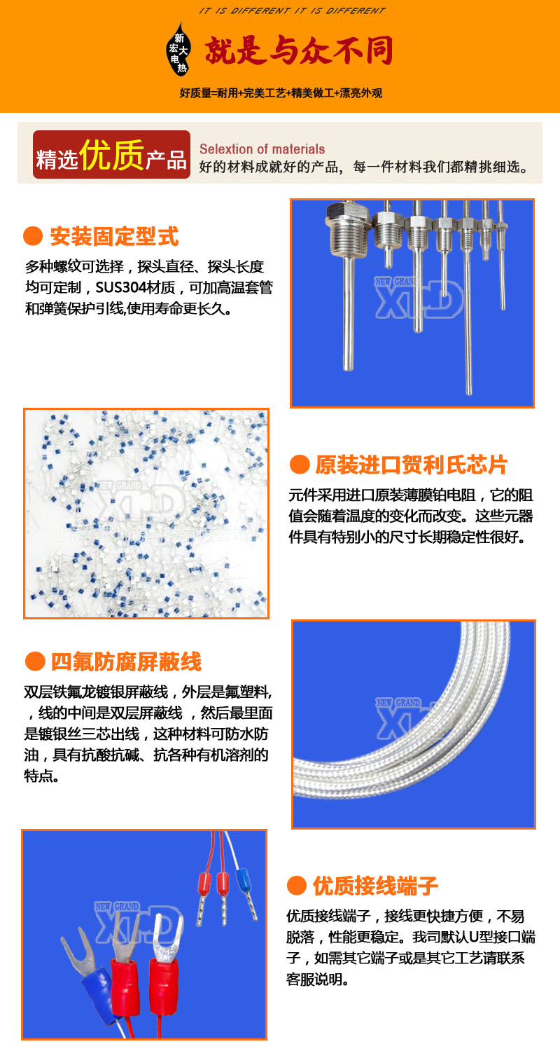 熱電阻外殼為不銹鋼304和316L,默認尺寸是直徑4mm*長度30mm(如要其他尺寸可咨詢客服),測溫范圍-50-200℃(另有特殊溫度范圍可選-200-200℃,或者是-50-500℃)引線是三線制雙包鐵氟龍鍍銀屏蔽線(防腐蝕耐油)。