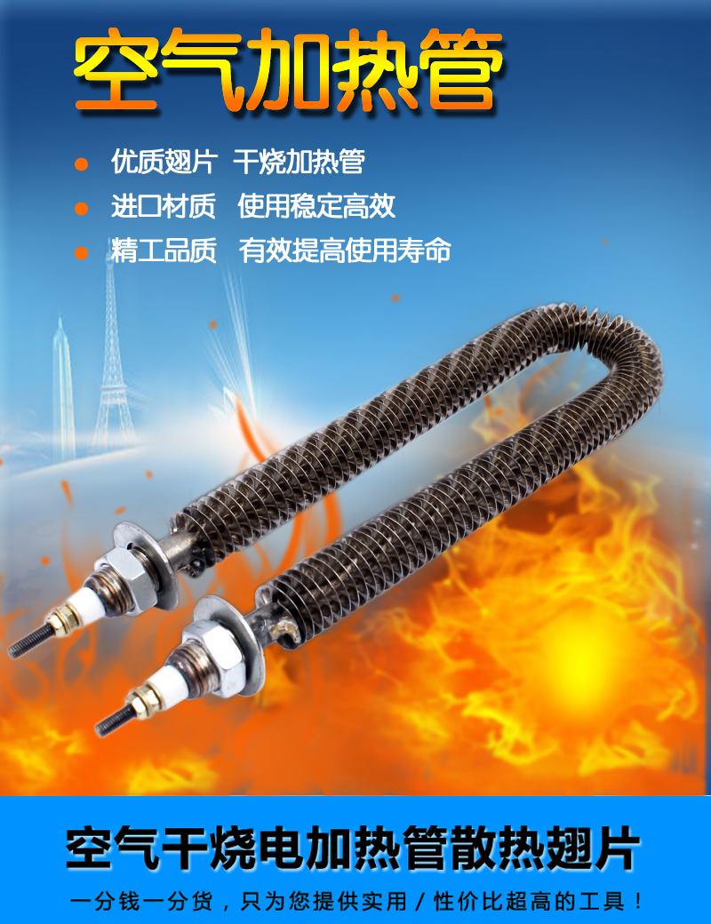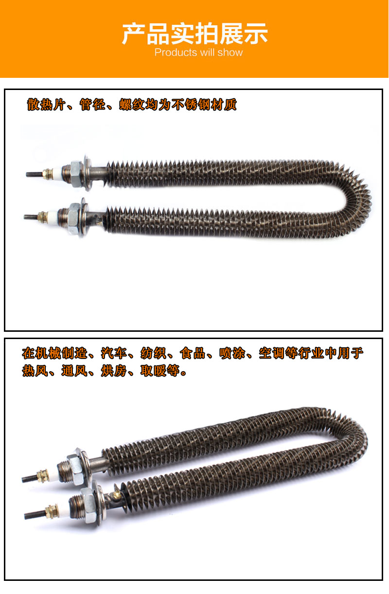 U型翅片加熱管采用優質不銹鋼、進口氧化鏷粉、高電阻電熱合金絲、不銹鋼散熱片等材料,通過先進的生產設備和工藝制作而成,翅片電加熱管可以安裝在吹風管道中或其它靜止、流動空氣的加熱場合。它與普通加熱管相比,散熱面積擴大了2~3倍,即翅片元件所允許的表面功率負荷是普通元件的3~4倍。由于元件的長度縮短,使得本身的熱損失減小,在相同的功率條件下,具有升溫快、發熱均勻、散熱性能好、熱效率高、使用壽命長、加熱裝置體積小,成本低等優點。根據用戶要求進行了合理的設計,便于安裝。產品在機械制造、汽車、紡織、食品、家電等行業,尤其在空調器風幕行業得到廣泛應用。